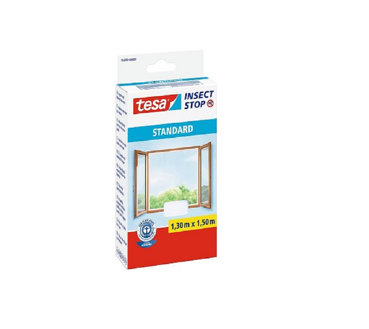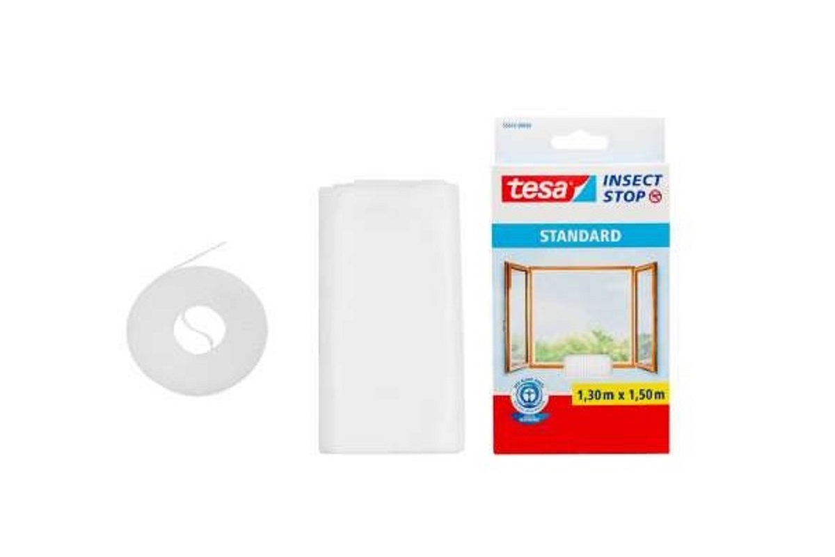 Presentación: CAJA con 1 red mosquitera Tesa Insect Stop Standard Tamaño: 1,30 m x 1,50 m + tira de 5.6 m. velcro autoadhesivo para montaje sencillo