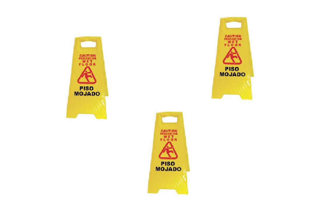 Cartel amarillo de aviso advertencia por piso mojado húmedo